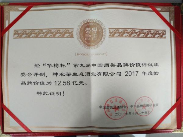 神農(nóng)架生態(tài)酒業(yè)有限公司2017年度的品牌價值為12.58億元