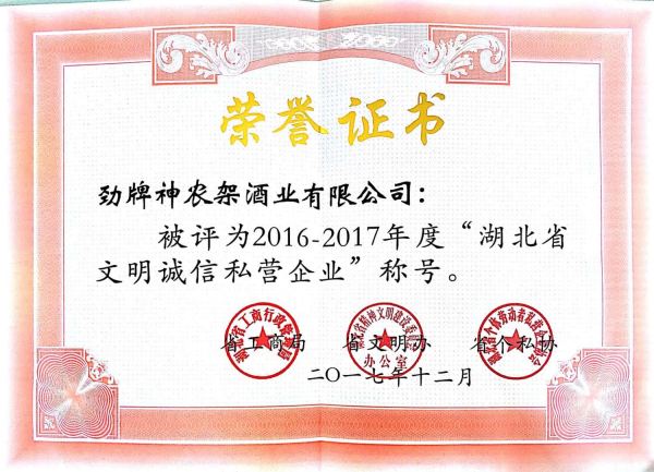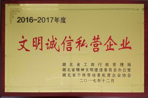 2017年12月 榮獲2016-2017年度“湖北省文明誠信私營(yíng)企業(yè)”稱號(hào)。