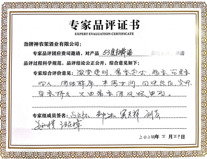 經(jīng)專家一致品評認(rèn)為,2018年神農(nóng)架封藏酒微黃透明,醬香突出,糧香、花果香怡人、酒體醇厚,豐滿甘潤,回味悠長,空杯留香持久,大曲醬香風(fēng)格典型。